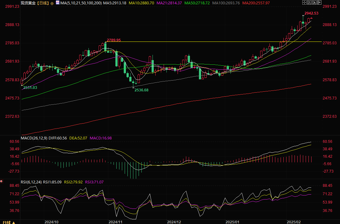不过,美元指数周四大跌 0.89%,收报107.05,为12月17日以来最低收盘价,使得以美元标价的黄金对外国买家来说不再昂贵,因为此前1月份生产者价格报告的部分内容指向了较低的通胀水平,而在白宫表示不会立即对其他国家实施对等关税后,美元进一步下跌。周四的生产者价格数据显示,核心个人消费支出(PCE)数据——美联储偏好的衡量指标——在本月晚些时候发布时,可能会低于此前对1月份的预期。尽管生产者价格的涨幅超过了经济学家的预期。