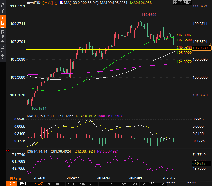 美元的下行压力主要来自于特朗普的关税言论。在周四(2月13日),特朗普签署了一项备忘录,要求政府工作人员准备应对多国的“对等关税”,其中明显将日本、韩国等国家列为重点对象。这一政策声明虽然并未立即实施,但已引发市场对于全球贸易风险的担忧,尤其是在美国的主要贸易伙伴中,这些政策可能会进一步拖累美元的表现。对于短期内美元走势的影响,市场普遍看空,预计美元将持续震荡,并且有可能会跌破当前的支撑区域。