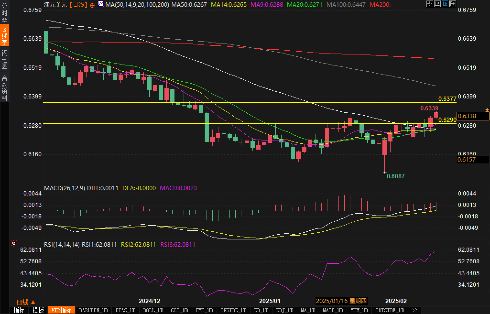 汇通财经APP讯——周五(2月14日)欧洲交易时段,目前澳元/美元迎来了连续第二个交易日的上涨,主要受到美国总统特朗普决定推迟实施互相加征关税的消息影响。与此同时,美元在美国国债收益率全线下行的背景下出现疲软,推动了澳元/美元汇率的走强。尽管市场对全球经济不确定性的担忧依旧存在,但这一消息提振了市场的情绪,促使澳元迎来一波反弹。