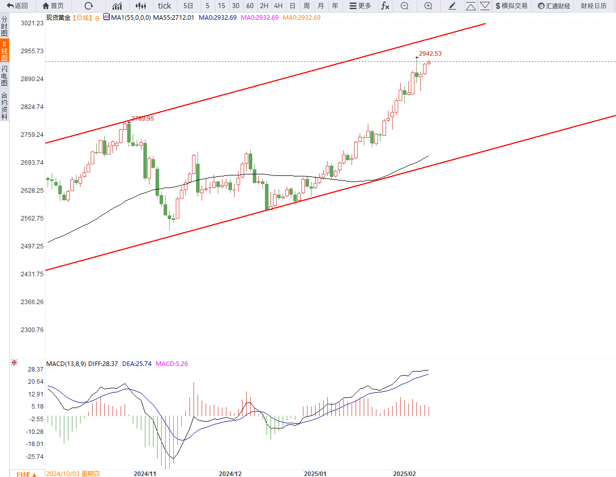技术面分析:2940美元为关键分水岭从技术图表来看,黄金日线级别已接近前期高点,MACD指标显示多头仍占据主导。盘中回调后,均线系统拐头向上,短期趋势依旧偏多,若突破2940美元则有望继续向上加速。