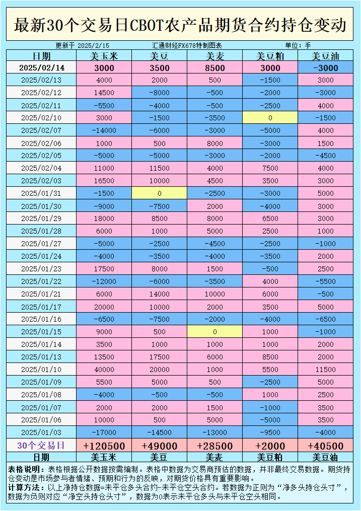从CBOT基金持仓来看,2月14日玉米的投机性净多头持仓为3000份合约,显示出资金的看涨情绪。相比于前几日的持仓数据,这一增幅反映了市场对天气和出口需求的乐观看法。然而,随着阿根廷及南美其他主要产区的生产压力不断积累,玉米市场的供应隐忧可能会对未来走势产生一定压力。短期来看,市场情绪仍倾向乐观,但中期是否能够突破近期的高点,仍需关注全球供应和政策变化的动态。