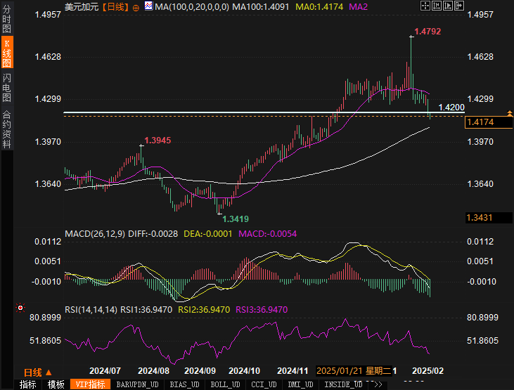加元 (CAD) 技术分析加元继续受益于美元疲软的背景,USD/CAD进一步跌破1.4200,接近1.4000的技术支撑区。尽管加拿大本周没有发布重要经济数据,但美国零售销售的疲软进一步助推加元上涨。市场目前关注下周的加拿大CPI数据,若通胀数据强劲,将可能进一步支撑加元上涨。