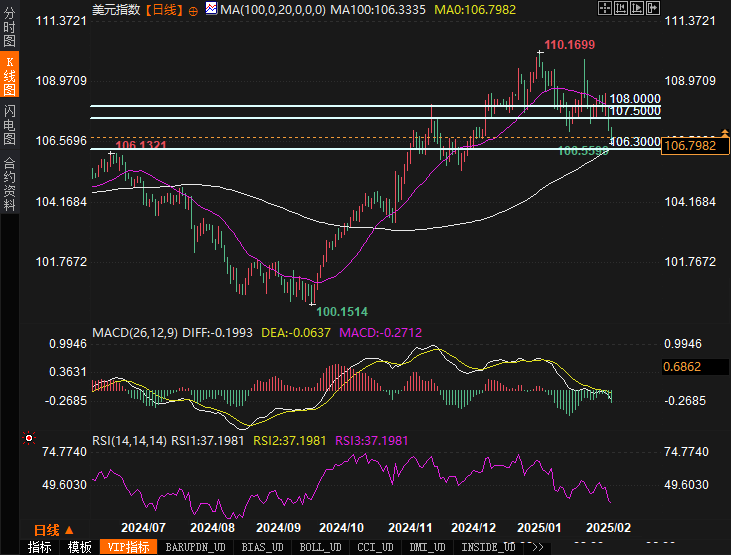 美元指数 (DXY) 技术分析美元指数(DXY)继续承压,跌破了20日SMA,展现出进一步下行的风险。RSI持续走弱,移动平均收敛发散指标(MACD)也维持在熊市区间,显示出负面动能。当前的初步支撑位位于100日SMA附近的106.30,若跌破该水平,可能确认短期看空趋势。上行阻力则位于107.50和108.00。