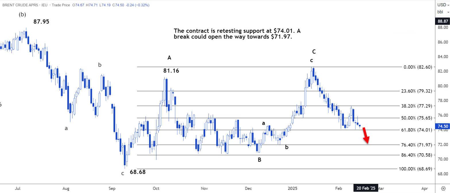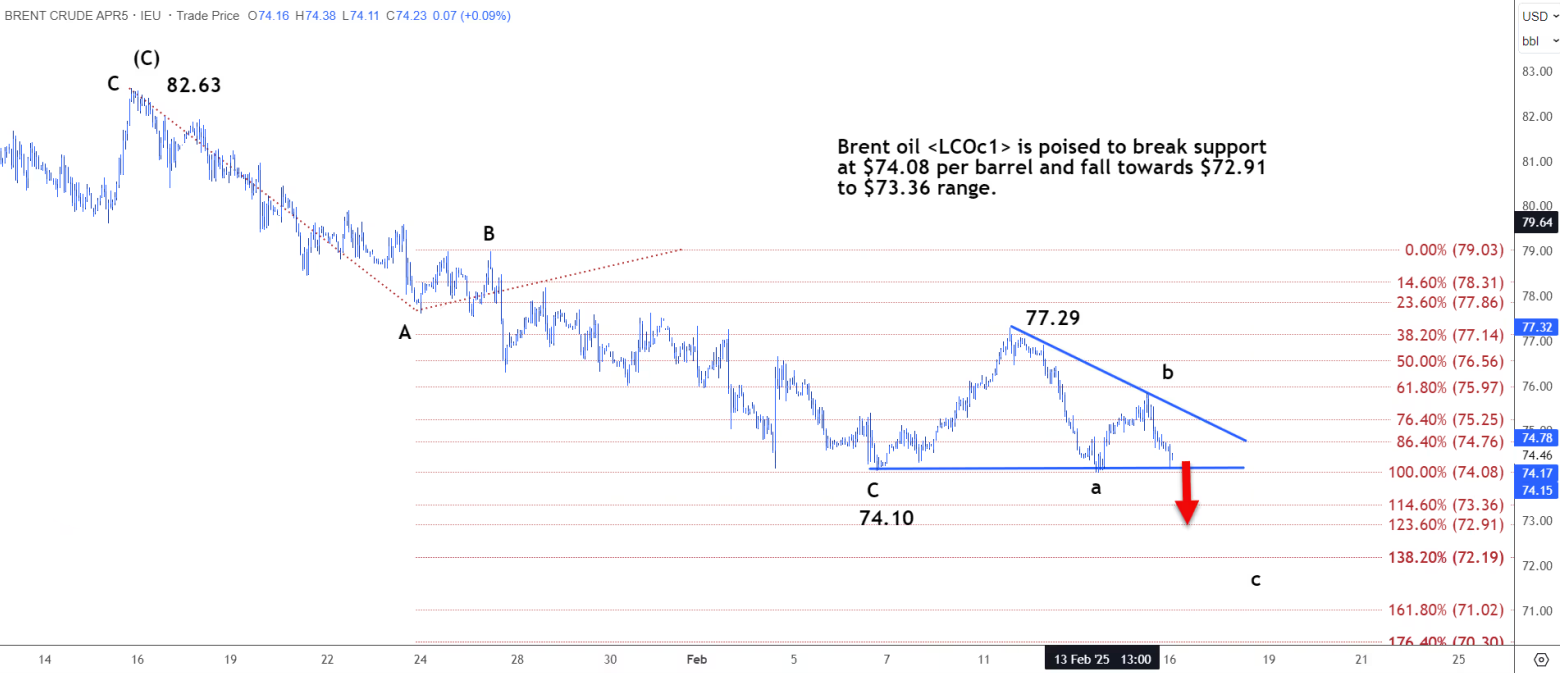 布伦特原油有望跌破每桶74.08美元的支撑位,跌至72.91美元至73.36美元的区间。