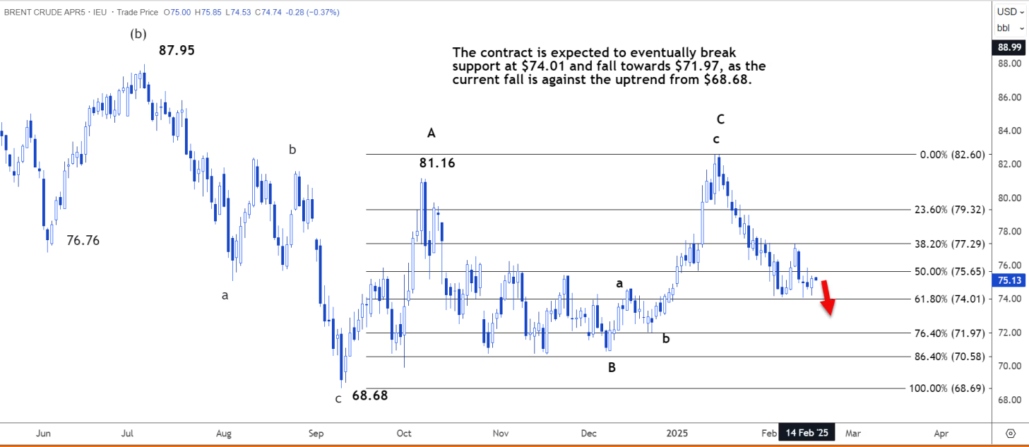 支撑位在 74.76 美元,跌破该水平可能跌至 73.36-74.08 美元区间。日线图显示,预计该合约最终将跌破 74.01 美元支撑位,跌向 71.97 美元,因为当前跌势与自 68.68 美元以来的上行趋势相反。
