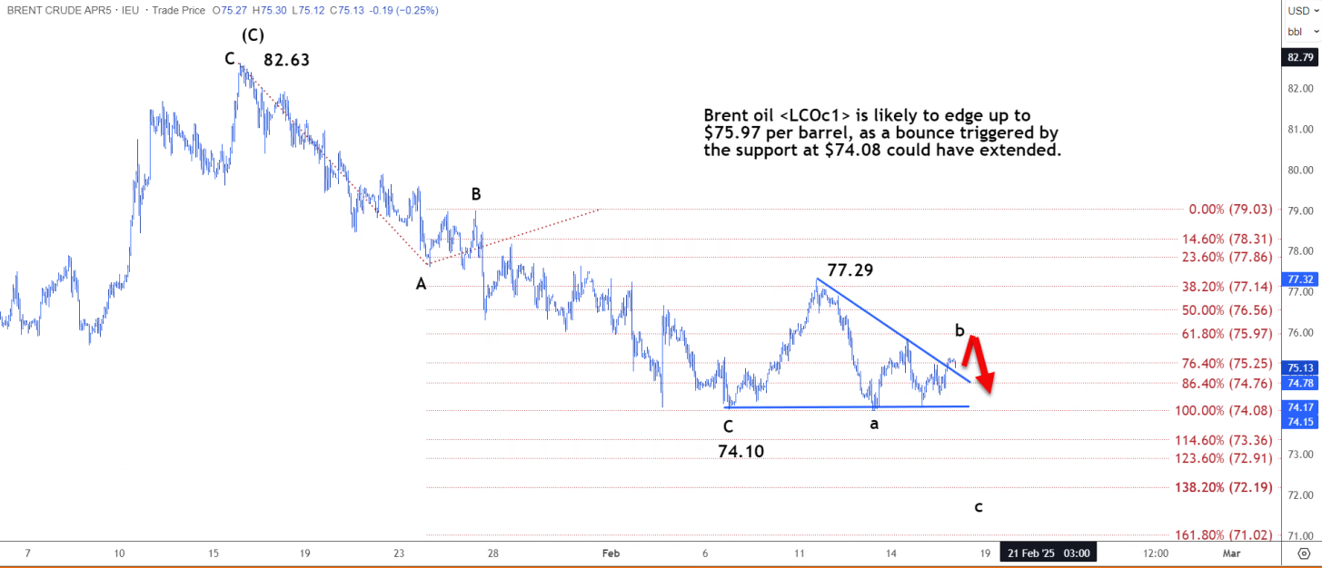 布伦特原油可能上涨至每桶 75.97 美元,因为 74.08 美元的支撑位引发的反弹可能会延续。