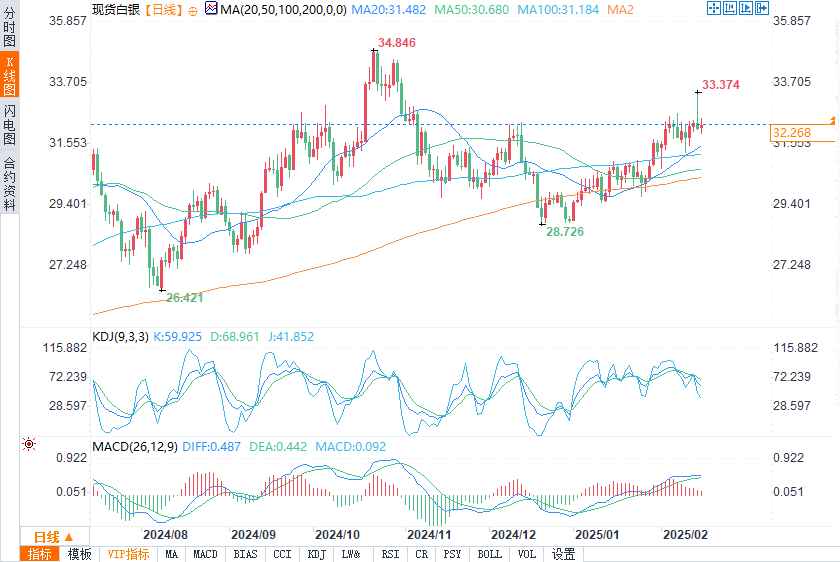 美国关税和市场价差推动白银需求白银近期走强的一个关键因素是对美国贸易政策的担忧。原定于近期实施但后推迟至3月的高额进口关税威胁,推动了美国纽约商品交易所(Comex)白银期货价格飙升。3月合约最新上涨3.3%,至33.79美元。