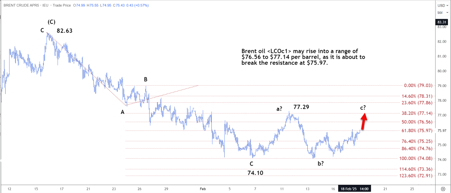 布伦特原油可能升至每桶 76.56 美元至 77.14 美元的区间,因为它即将突破 75.97 美元的阻力位。