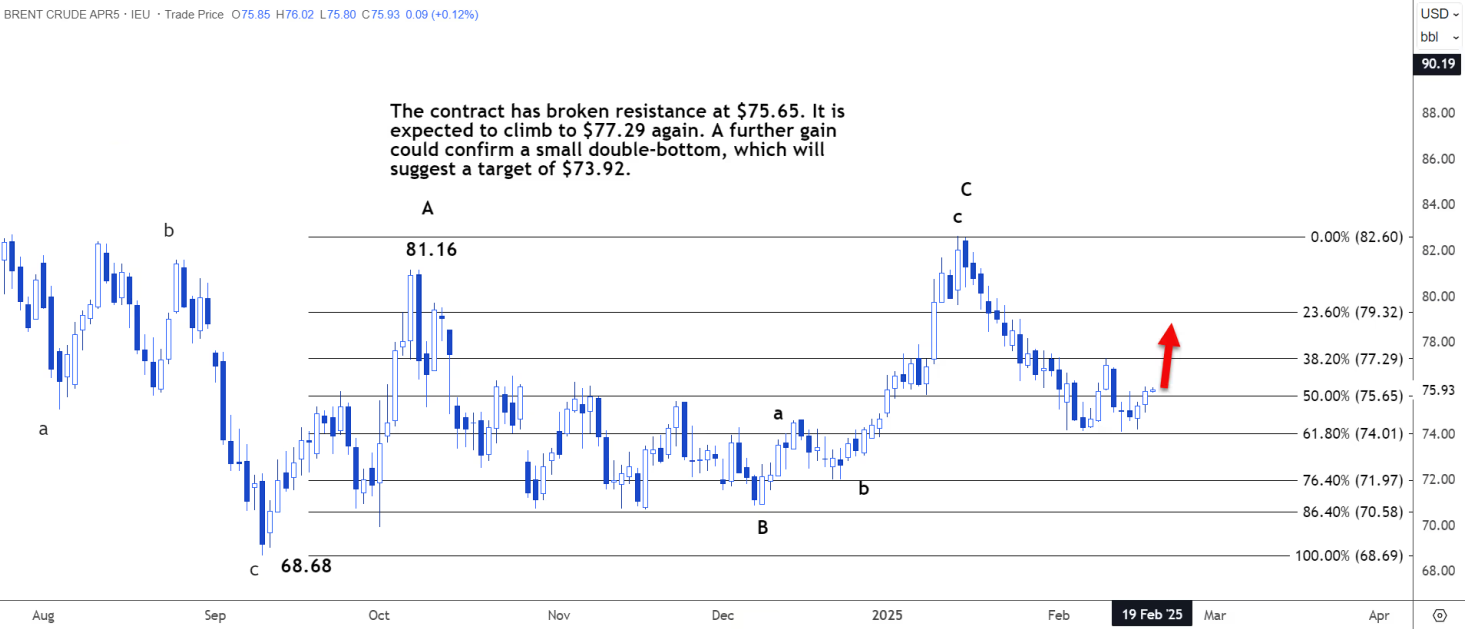标题:技术分析:布伦特原油可能升至76.56--77.14美元区间