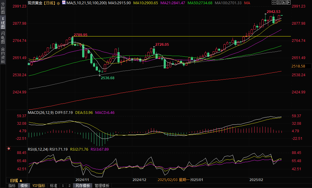 现货黄金窄幅震荡,目前交投于2933.76美元/盎司附近。金价周二上涨超过1%,盘中最高触及2936.82美元/盎司,再度逼近上周触及的历史高点,收报2935.13美元/盎司,美国总统特朗普关税计划的不确定性引发了对经济增长的担忧,促使避险资金流入黄金。市场还关注美俄官员在沙特的会谈以及本交易日将出炉的美联储1月份货币政策会议的纪要。