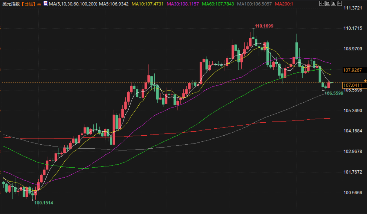 美元指数周二上涨0.3%,报107.08,距离上周五触及的两个月低位106.56不远。其中兑欧元领涨,关税忧虑和紧张的俄乌冲突谈判引发了避险买盘。