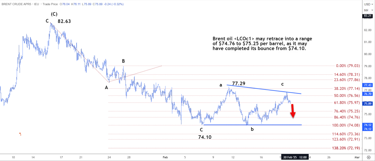 路透技术分析师周四指出,布伦特原油可能回撤至每桶 74.76 美元至 75.25 美元的区间,因为它可能已完成从 74.10 美元的反弹。