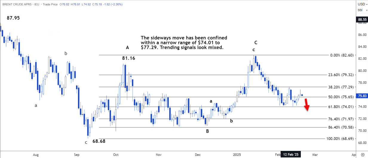 日线图显示,横向走势被限制在 74.01 美元至 77.29 美元的窄幅区间内。趋势信号看起来好坏参半。