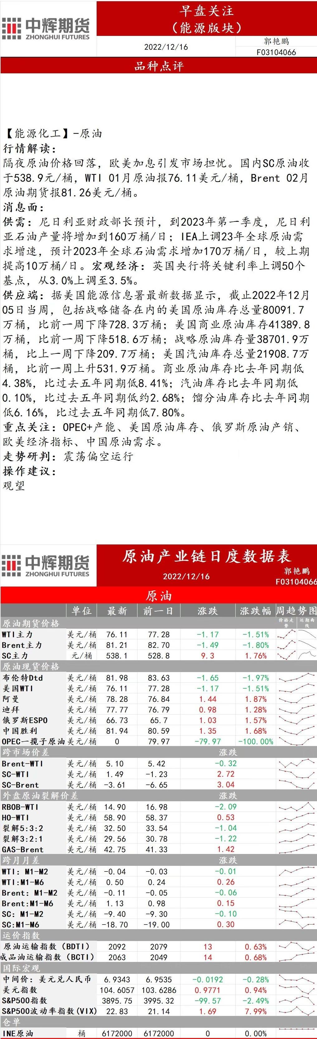 12月16日,中辉期货发布能源早盘关注,称价格将震荡偏空运行,建议观望。