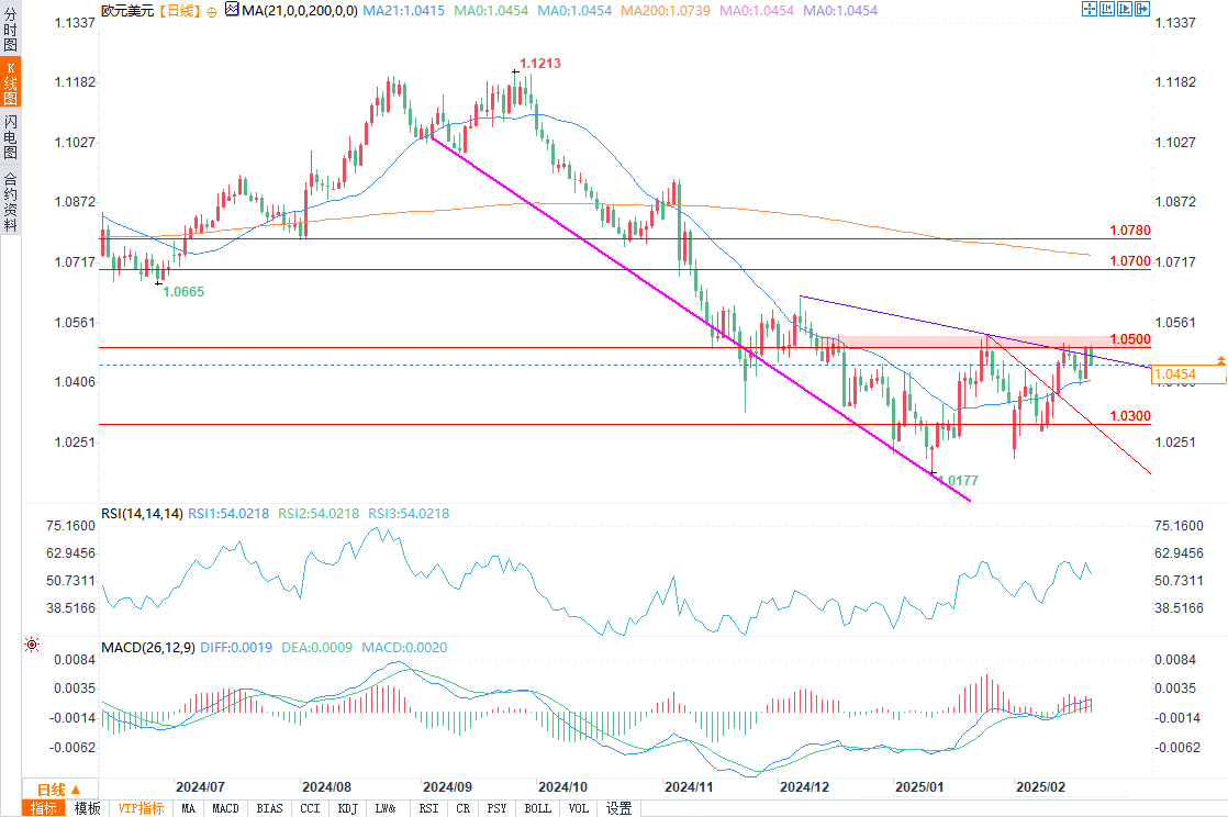 汇通财经APP讯——周五(2月21日)美盘时段,由于今晨早些时候公布的一些不太理想的采购经理人指数(PMI)数据,欧元/美元汇率再次跌至1.05关口下方,投资者也对即将在周末举行的德国大选持谨慎态度。当前的直接焦点是即将公布的美国采购经理人指数以及修正后的密歇根大学消费者信心和通胀预期数据。但在下周五美国核心个人消费支出(PCE)价格指数公布之前,不会有任何重大数据出炉,这意味着美元的所有焦点将集中在特朗普、关税和乌克兰和谈上。围绕乌克兰和平谈判的乐观情绪为欧元/美元的前景提供了一定支撑。然而,近日由于关税问题以及唐纳德·特朗普总统和乌克兰总统弗拉基米尔·泽连斯基之间酝酿的争端,市场情绪受到了轻微冲击。尽管如此,人们仍希望最终能达成协议。