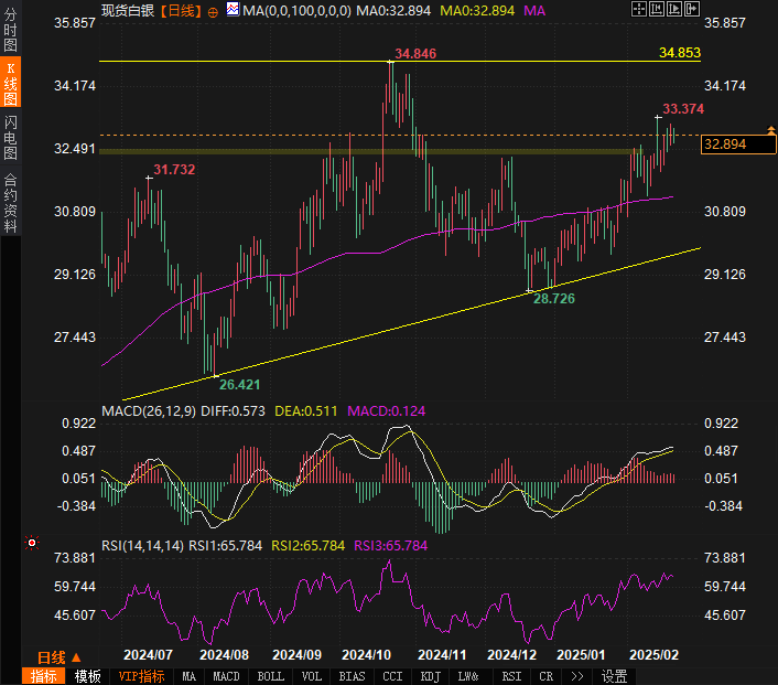 从技术面来看,若白银价格成功突破34.87美元的阻力位,则可能打开新的上行空间。然而,短期内,若美元继续强势,白银价格可能维持震荡走势,并在30.00美元附近获得一定支撑。因此,投资者需关注美联储政策和特朗普关税言论的进一步发展,这将直接影响白银市场的走势。