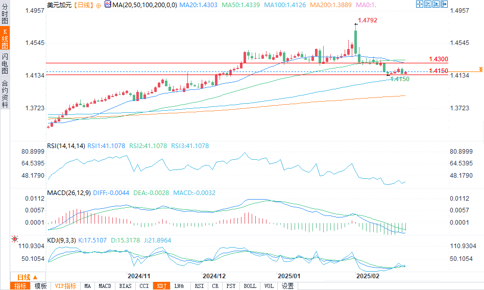 RSI值约为41,处于50下方,通常表示市场处于弱势区域,意味着美元/加元在近期卖方力量较强。但数值未进入超卖区域。