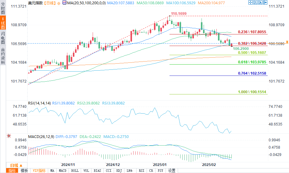 美元指数目前处于技术性下行趋势,短期内的技术面依然呈现看跌信号。OCBC的外汇分析师Frances Cheung和Christopher Wong指出,DXY的关键支撑位位于106.30/40区域,这一水平包括100日均线和10月低点到1月高点的38.2%斐波回撤位。如果该支撑位有效突破,可能会导致进一步下行,目标价位将指向105.50和105.20(50%斐波回撤位)。