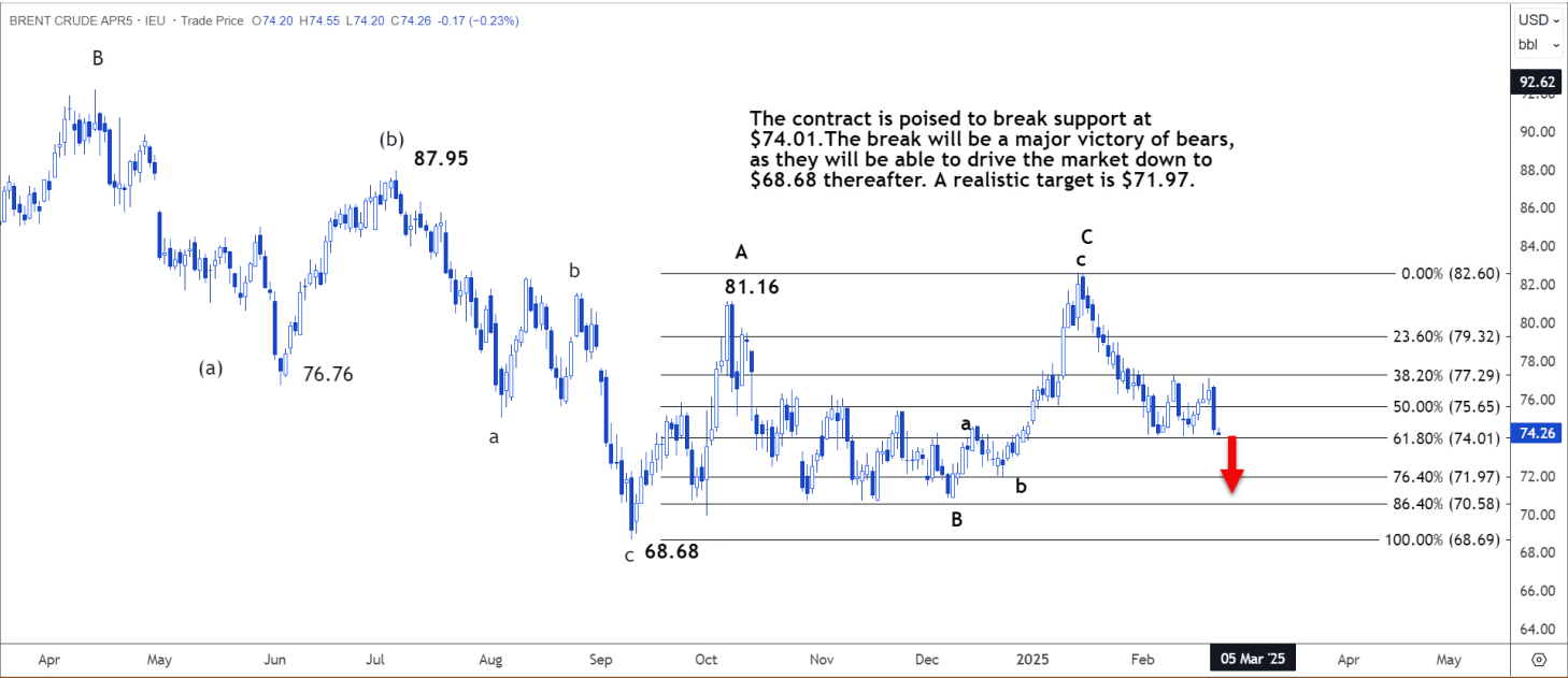 布伦特原油可能稳定在每桶74.08 美元的支撑位附近,并试图小幅反弹至 75.25 美元,然后恢复下行趋势。