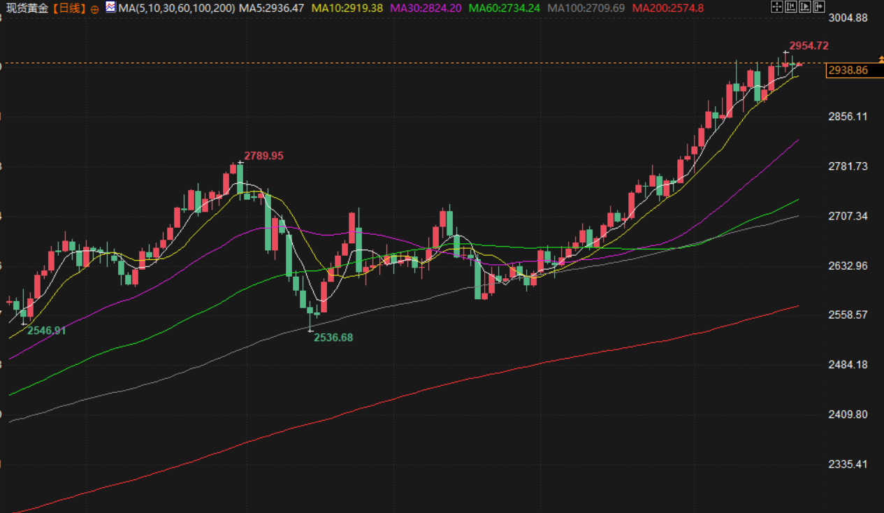 现货黄金交投于2938.86附近,金价上周连续第八周上涨,受助于美国总统特朗普的关税计划引发强劲避险需求;