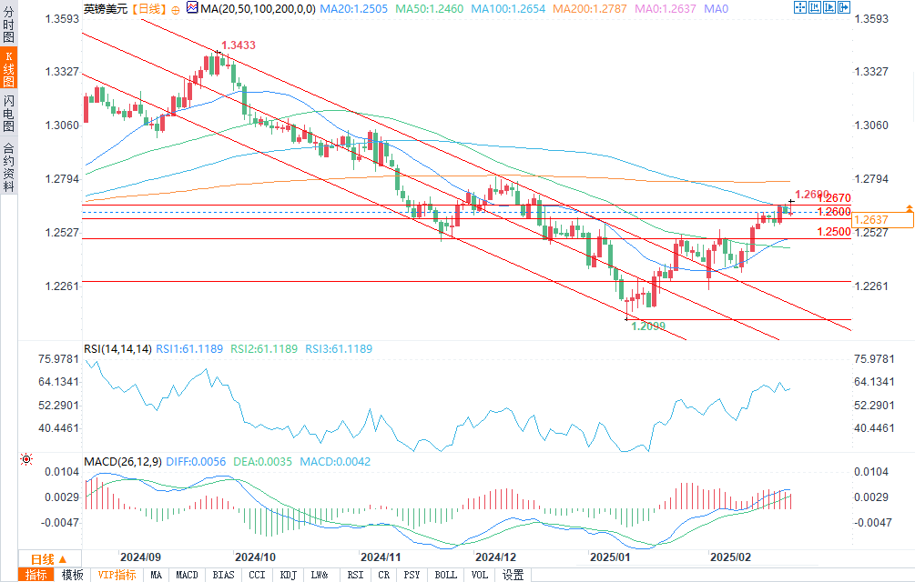 直接支撑位可看1.26和1.25。若跌破此处,1.2470的50日移动平均线将发挥作用。