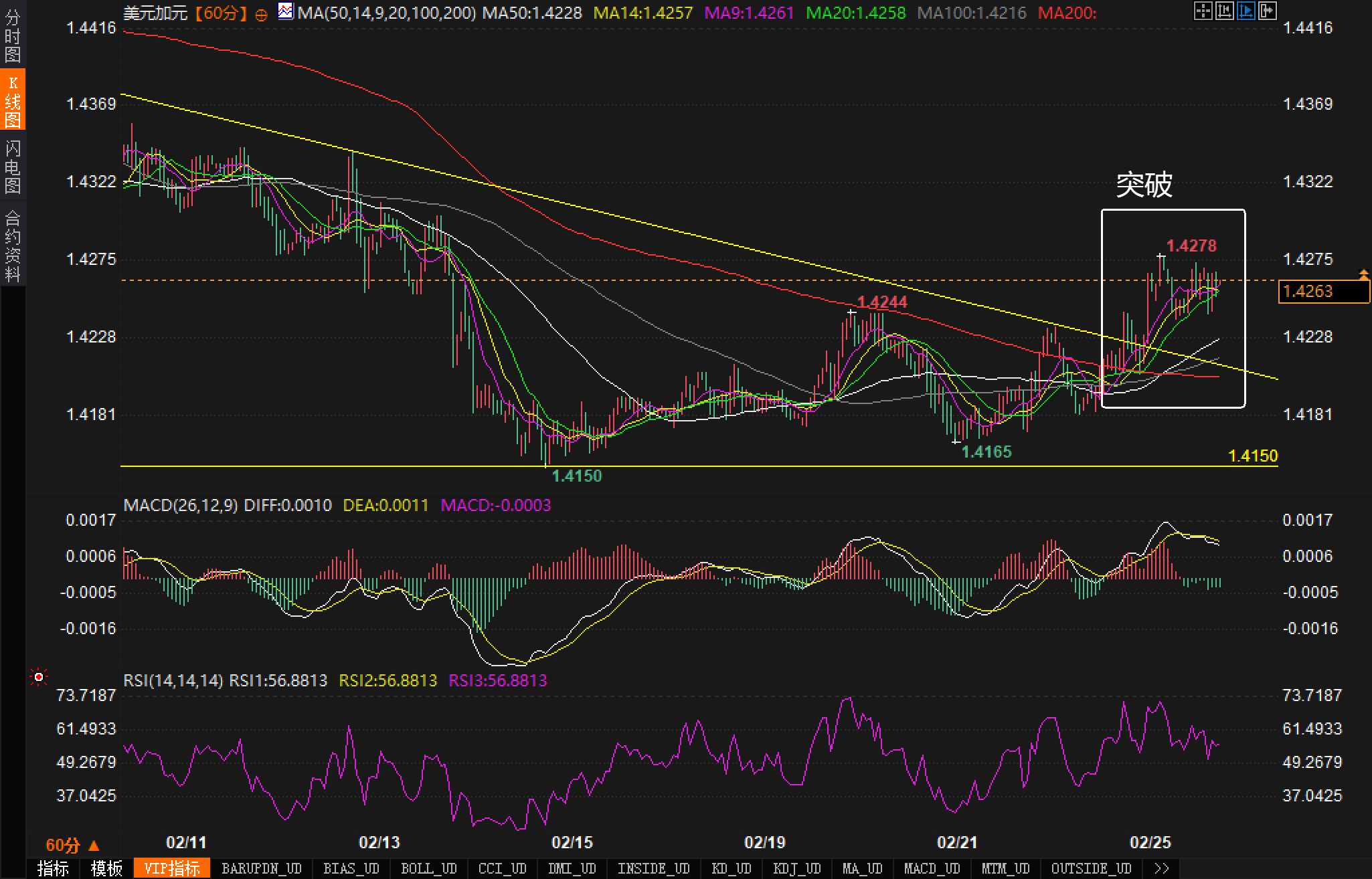 首先,从技术形态上看,美元/加元在小时图上突破了之前形成的下降三角形图形。下降三角形的上边界在2月9日的高点1.4380处,而下边界则在2月14日的低点1.4151处。这一突破暗示了短期内上涨的可能性。