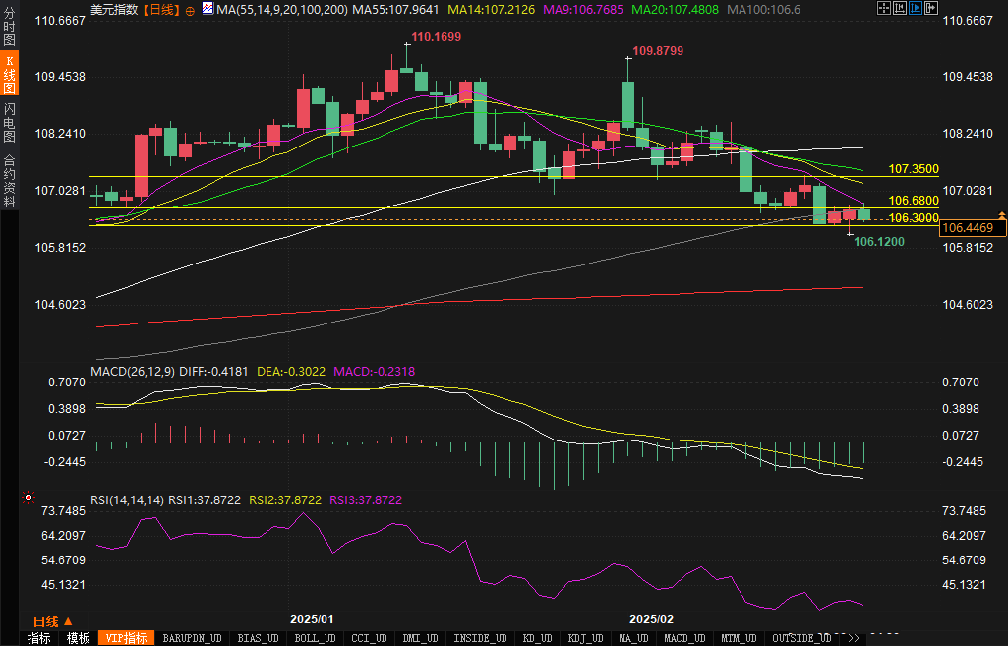 美元指数当前处于技术面整理阶段,市场情绪较为谨慎。上行的关键阻力位在100日SMA附近,而下行的支撑位则在106.52和105.89区域。关注这些关键技术水平的突破情况。如果