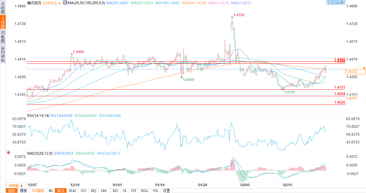 展望未来,如果美元/加元进一步上涨超过2月9日的高点1.4380,将打开通往1.4400整数关口和1.4500心理阻力位的大门。