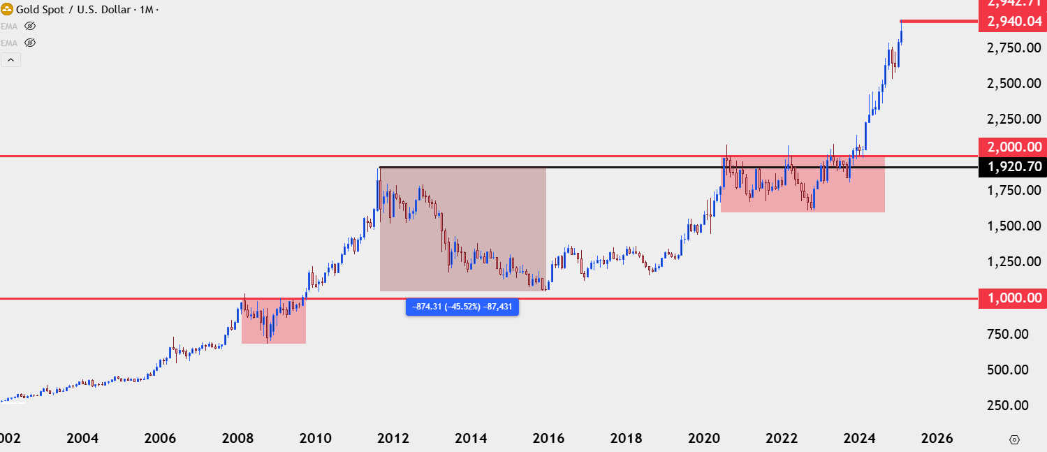 2000美元这一价位作为阻力位持续了三年半的时间,一直到2023年12月。然后在去年年初,这一价格开始成为短期支撑位,尽管通胀数据强劲,但美联储的鸽派立场在很大程度上推动了这一情况。