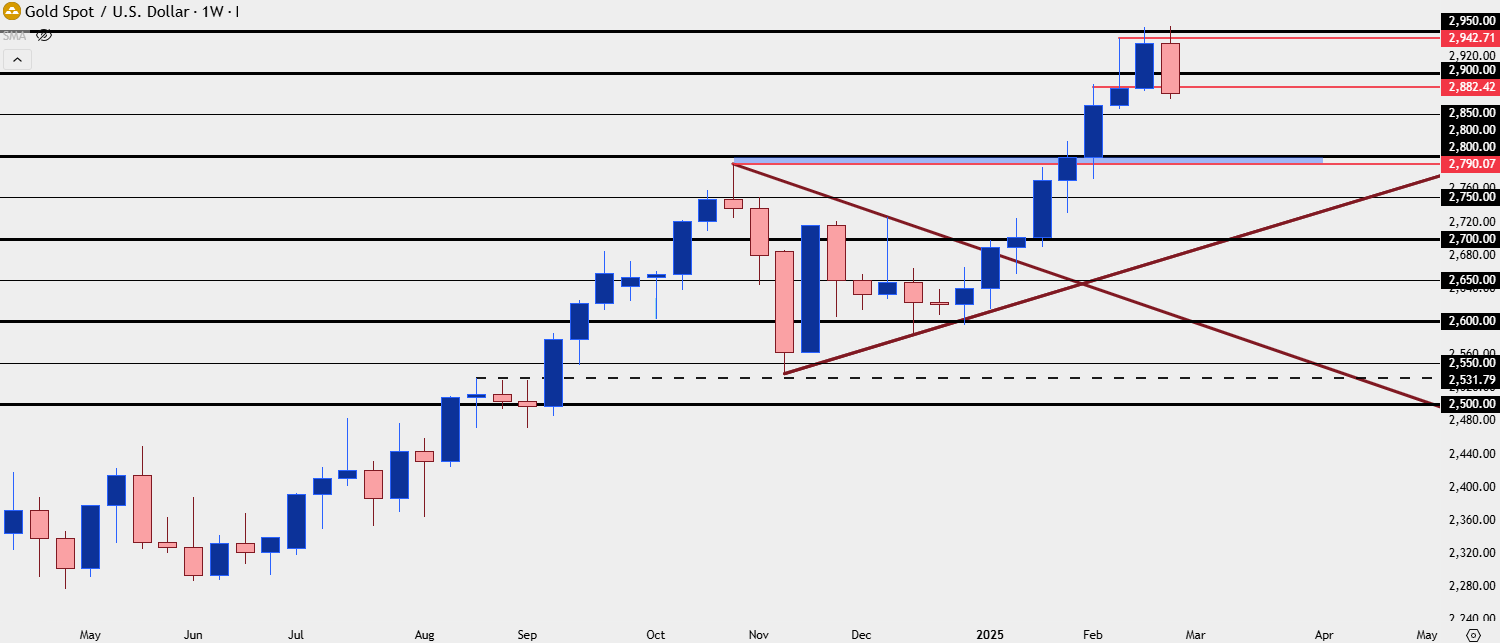 黄金3000美元关口的动态情况周一,我曾撰文谈到这一点:像每盎司3000美元这样的重要心理关口,黄金可能需要一些时间才能最终站稳。周一我写下这些时,充分意识到2025年以来黄金多头一直保持的上涨动力,但从之前对1000美元和2000美元关口的测试来看,我们可以发现,黄金在首次测试这些重要整数关口时,很难保持上涨动力。