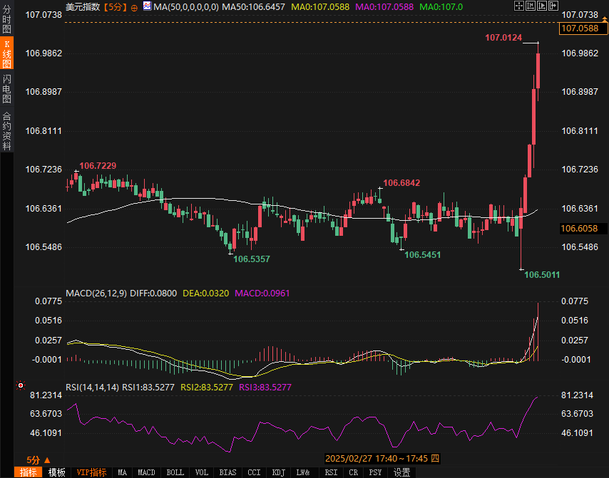 美元指数在数据发布后迅速拉升,突破107.00关口,最高触及107.1099,涨幅达到0.57%。