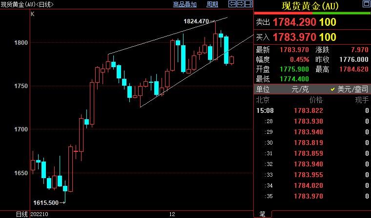 现货黄金上涨0.41%至1783.86美元/盎司;COMEX期金主力合约上涨0.33%至1793.7美元/盎司;