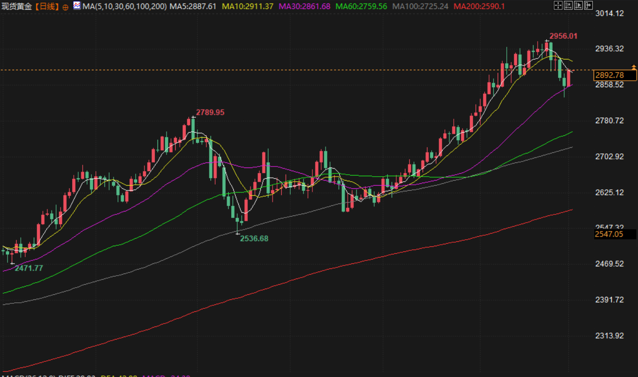 现货黄金交投于2892.72附近,金价周一在上一交易日跌至三周低点后上涨逾1%,原因是美元走软,以及对美国总统特朗普关税政策的担忧引发了避险买盘;