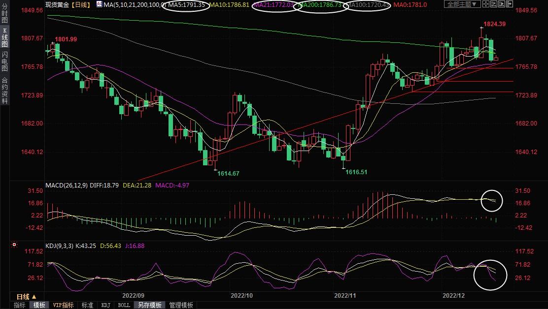 短线的话,12月6日低点1765.72附近也还存在一些支撑,11月30日低点支撑在1744.79附近,布林线下轨和11月23日低点支撑在1728.37附近。