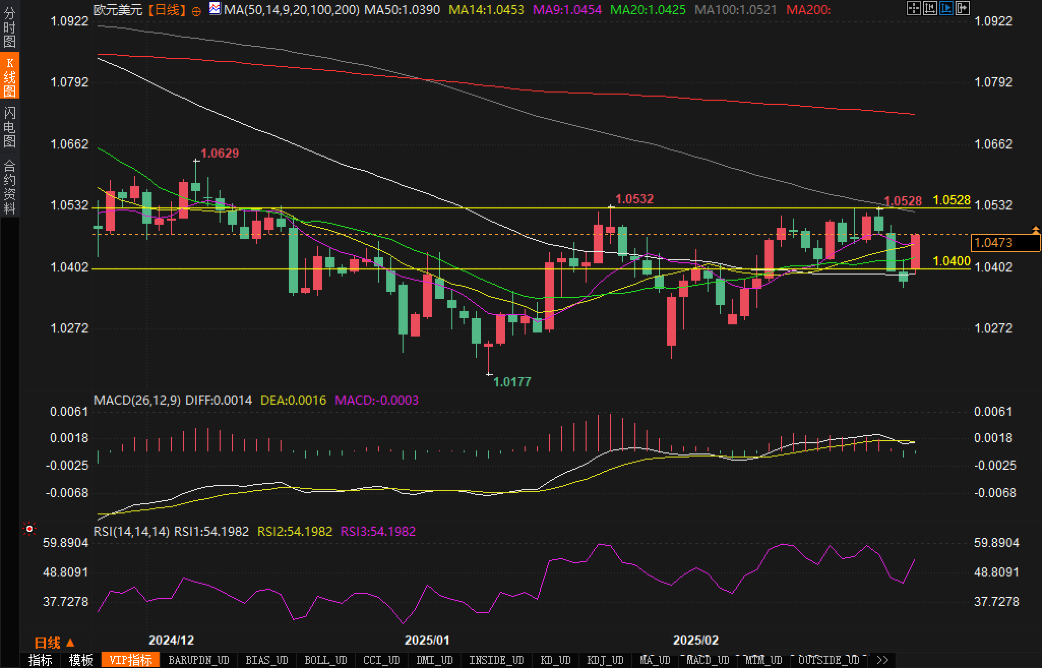 技术指标层面,MACD指标柱体逐渐收缩,DIFF线与DEA线黏合于零轴附近,表明短期内多空力量相对均衡,但仍存在转向看涨的可能性。此外,14日相对强弱指标(RSI)已回升至54水平附近,仍处于中性略偏多区域,预示短期多头力量逐步回暖,价格若能顺势站稳1.0470一线,则指标将可能进入明显的多头强化区域,为后续更大幅度上涨提供技术上的确认。