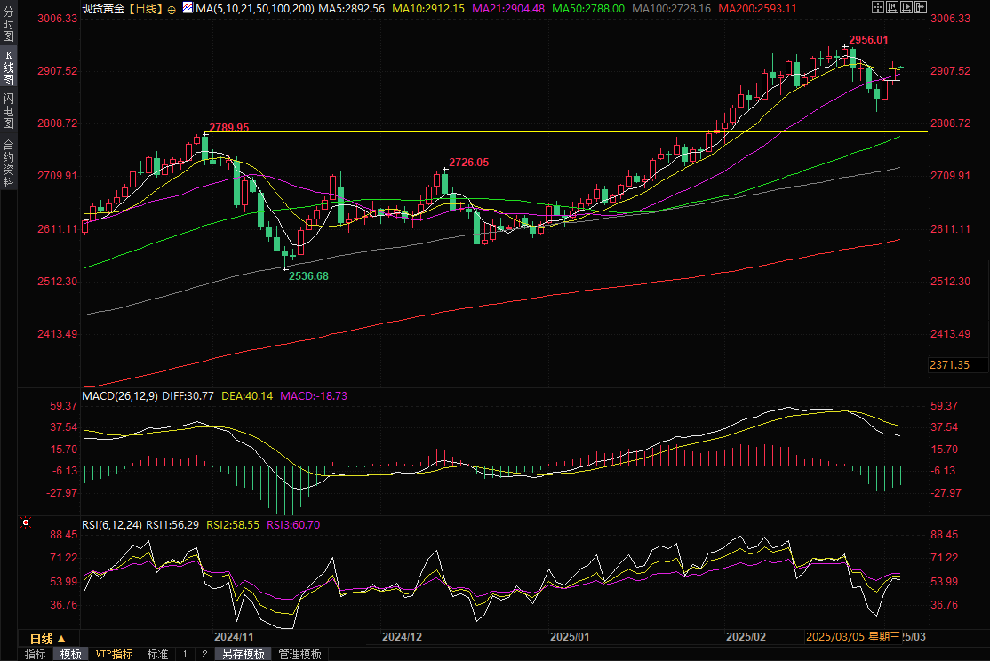 现货黄金高位窄幅震荡,目前交投于2915.90美元/盎司附近。在美国总统特朗普征收新关税后贸易冲突升级的背景下,美元走软至近三个月低位,避险需求增加,推动金价周二上涨0.84%(约24美元)至2917.56美元/盎司,盘中最高曾触及2927.66美元/盎司,为连续两个交易日上涨。