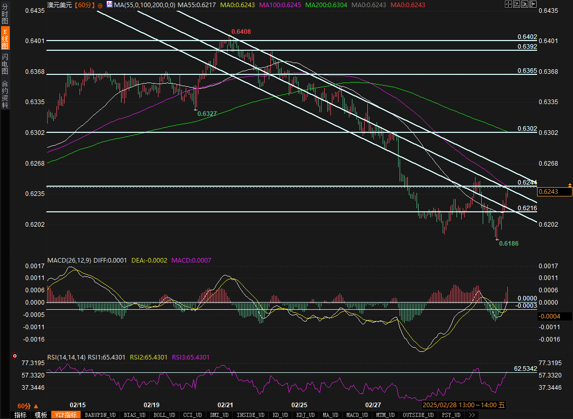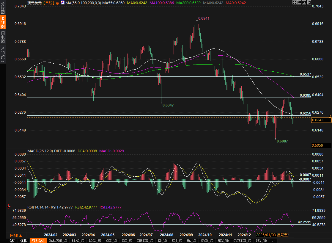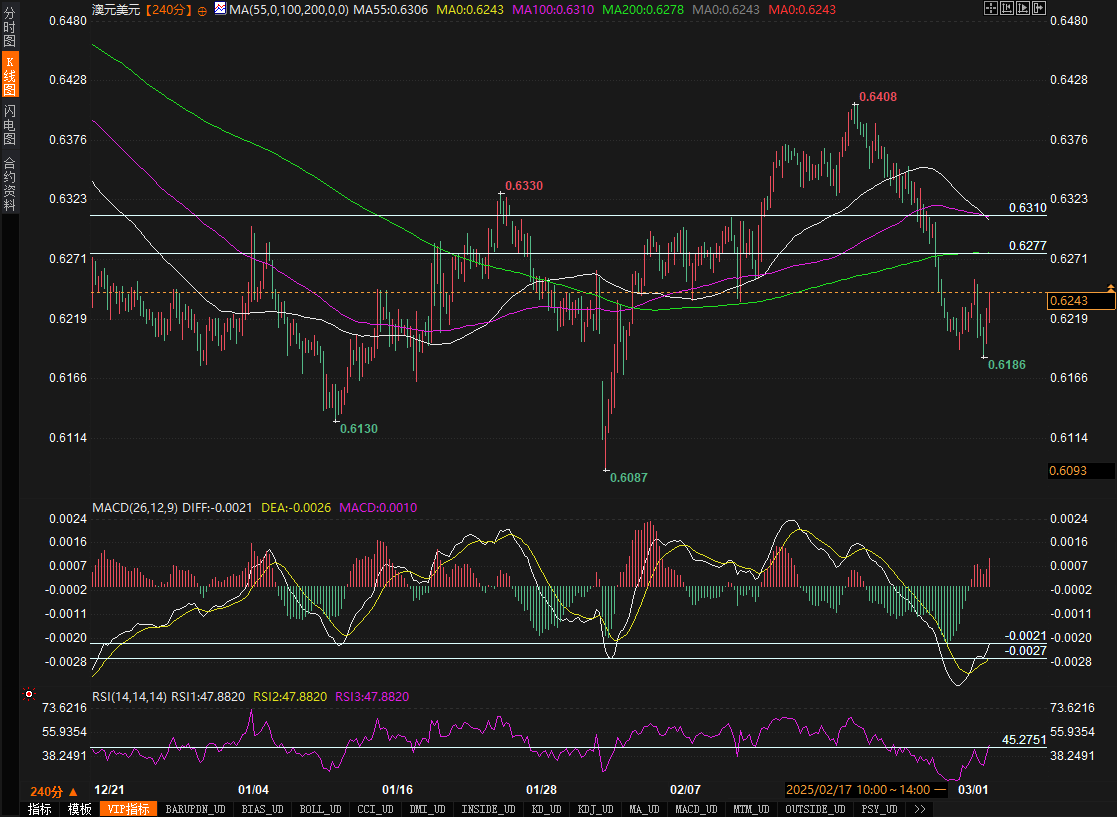 美元指数因市场对美联储年内三次降息的押注升温而承压,但澳元上行仍受制于铁矿石价格疲软及需求前景的不确定性。当前盘面呈现多空拉锯特征,短期方向需等待周五美国非农数据及下周中国关键经济指标的指引。
