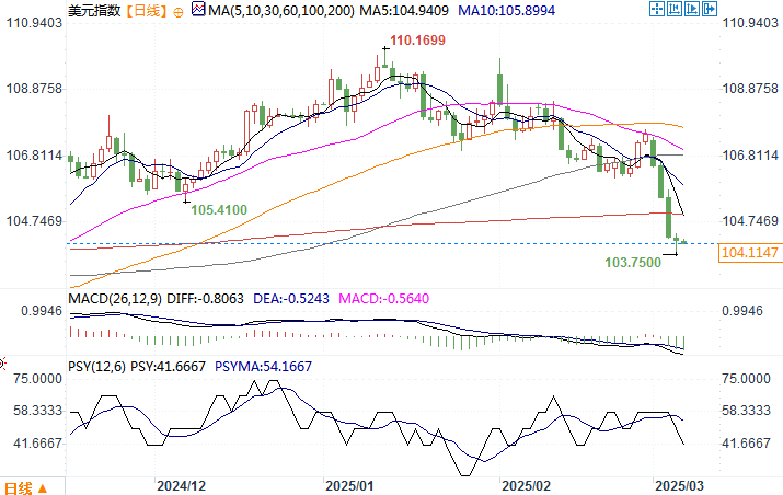 汇通财经APP讯——随着市场对特朗普政府实施的全面新关税政策做出反应,美元本周遭遇大幅抛售,兑主要货币暴跌逾3%。美元指数周一开盘报107.3500,周一至周四的跌幅分别为0.96%、0.93%、1.16%和0.11%,周四收盘报104.2000。