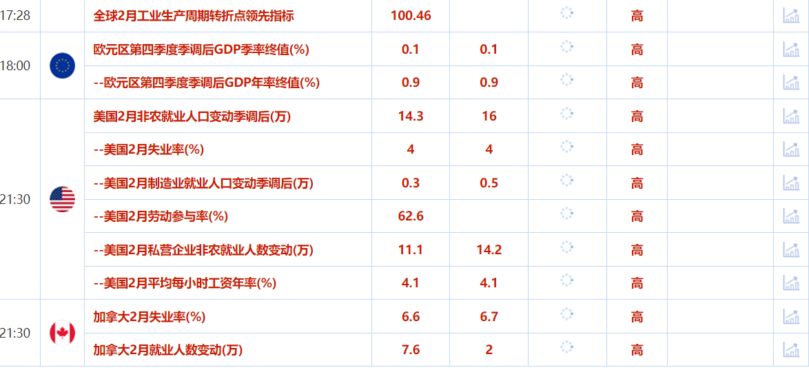 美国周二对从墨西哥和加拿大进口的商品征收 25% 的关税,不过,白宫周三证实,将在一个月内豁免汽车制造商的关税,但前提是它们必须遵守现有的自由贸易规则。所有目光都集中在周五公布的美国非农就业报告上,接受路透调查的经济学家预计该报