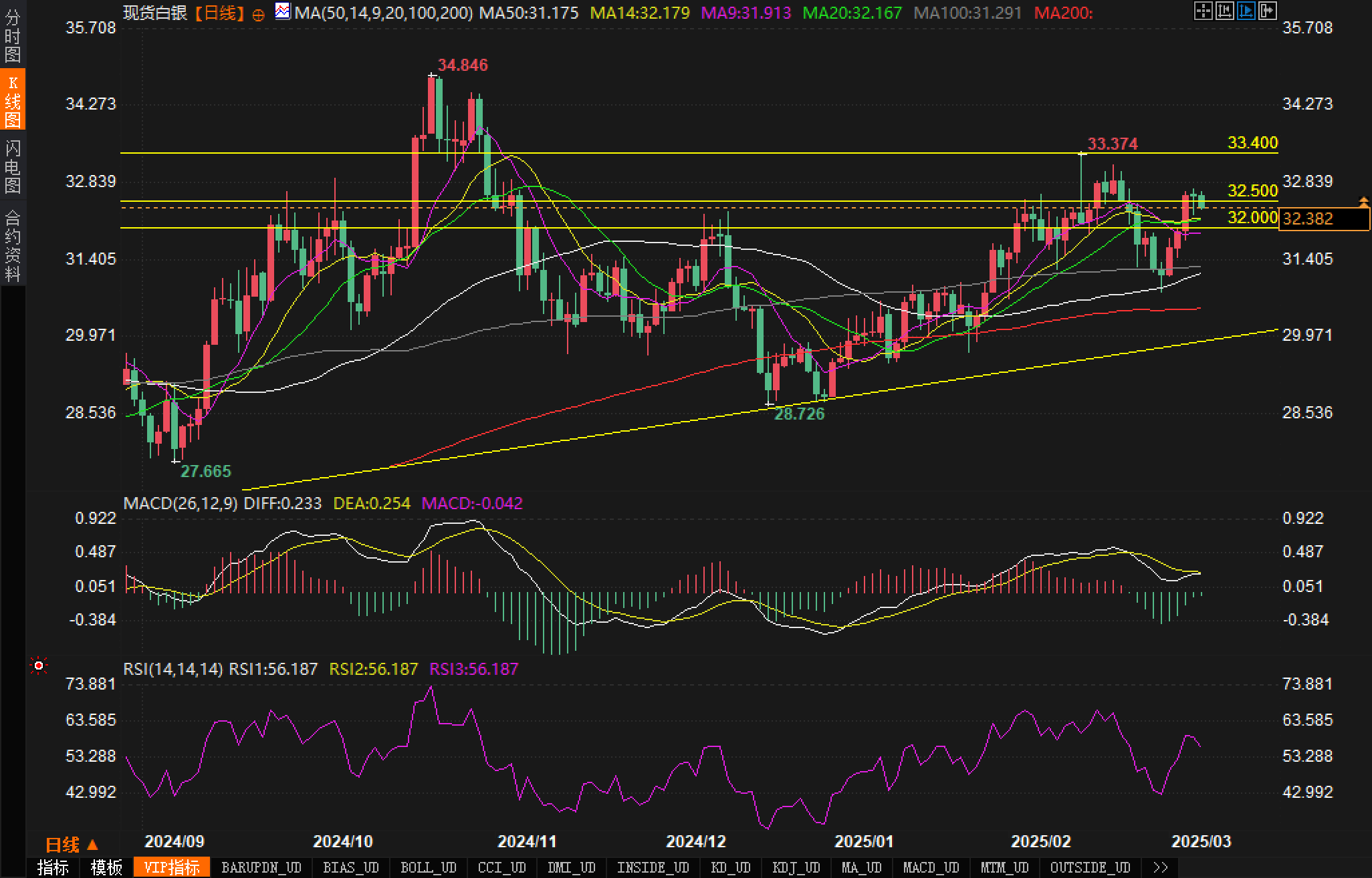 现货白银交投于32.38美元/盎司附近,日内跌幅约0.70%。今日欧洲交易时段,白银价格在32.70美元附近承压回落,市场谨慎等待美国2月非农就业数据的公布。