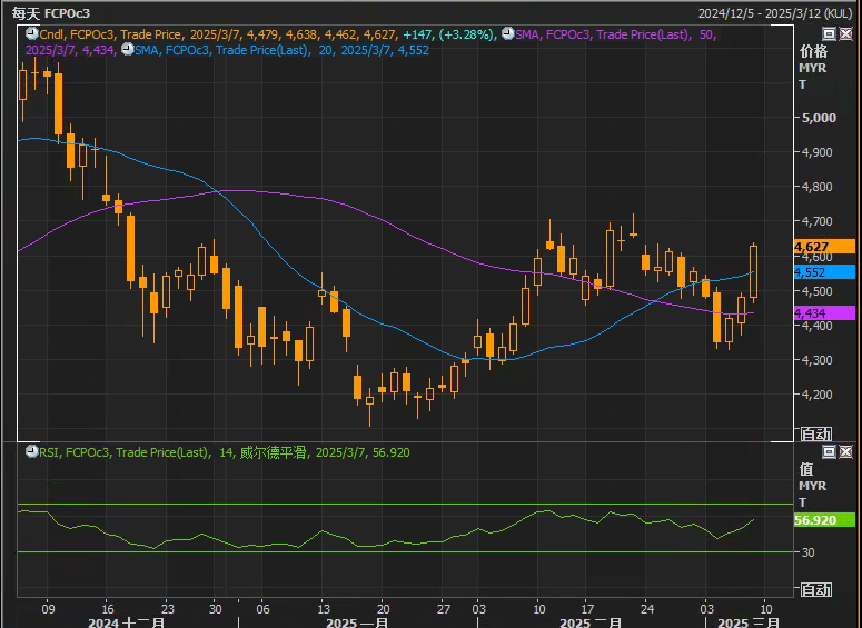 汇通财经APP讯——周五(3月7日),马来西亚棕榈油期货迎来一波凌厉上涨,5月交货的基准合约(FCPOc3)在 收盘时大涨147林吉特,涨幅达3.28%,报收4627林吉特/吨(约合1048.73美元/吨)。本周累计涨幅1.6%,结束了此前几周的震荡格局。这波涨势的直接推手是市场对马来西亚主要产区减产的担忧,叠加低位买盘和空头回补的集中发力。