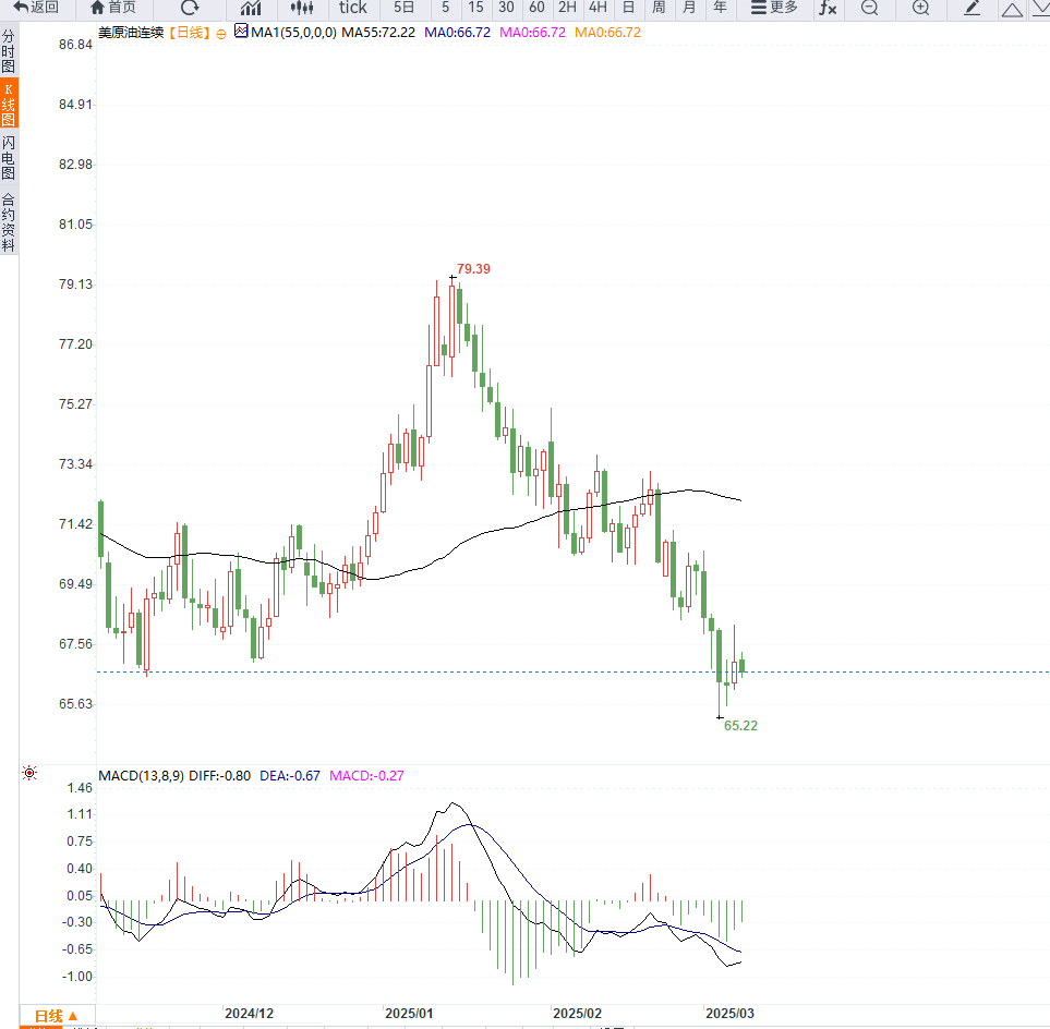 从技术指标来看,RSI指标接近超卖区间,MACD显示仍有下行压力,但在65美元附近可能获得买盘支撑,市场或迎来短期反弹。