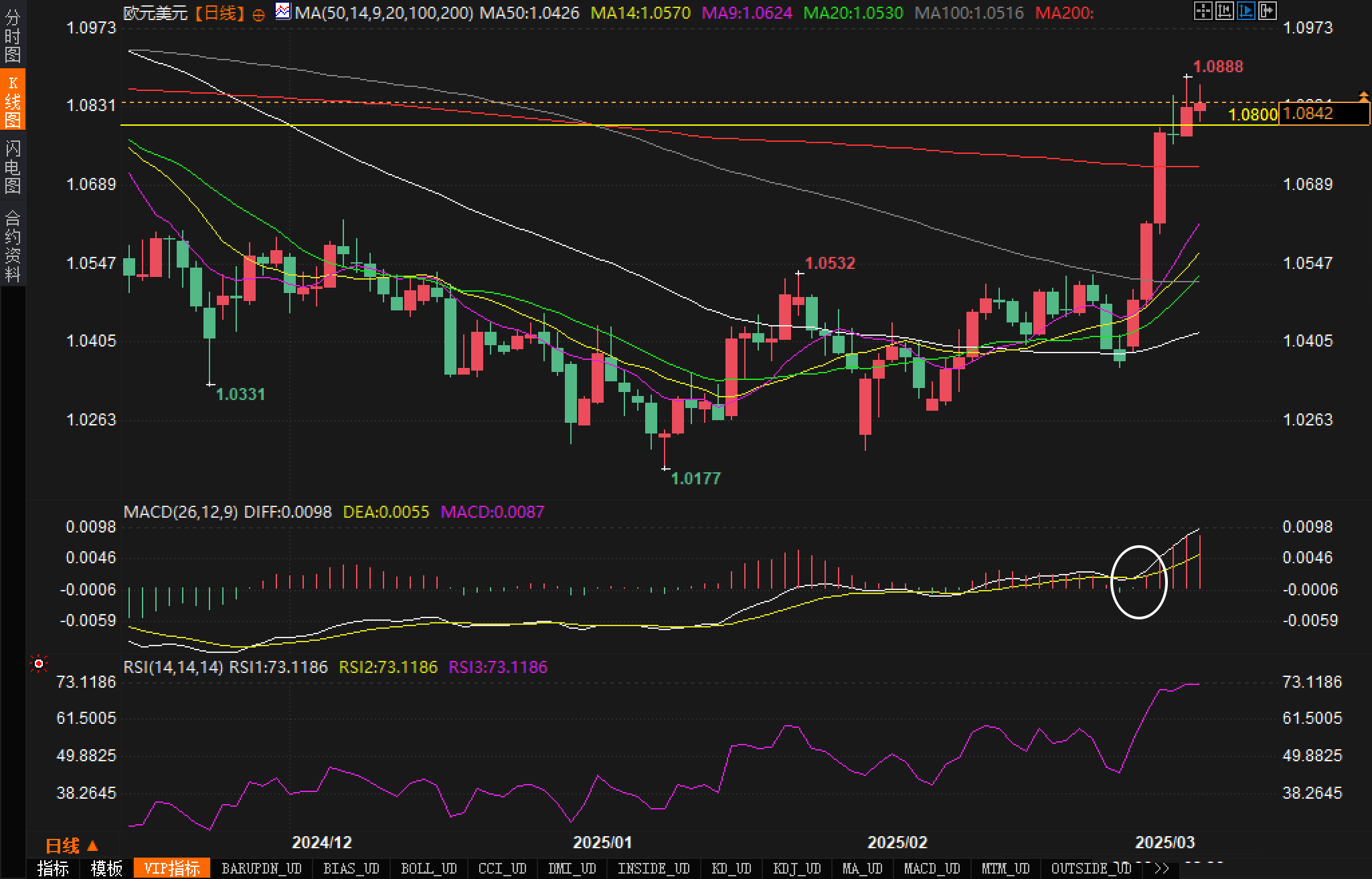 日线图显示,汇价成功突破了1.0800关键阻力位,并进一步向1.0880水平推进。从技术指标看,RSI指数已上升至73附近的超买区域,这表明短期内可能面临调整压力,但强劲的上升动能仍在继续。