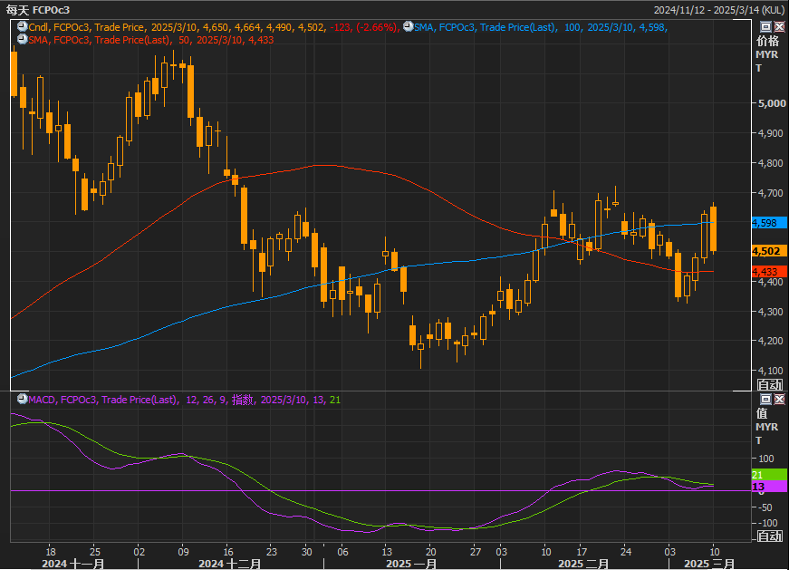 汇通财经APP讯——周一(3月10日),马来西亚棕榈油期货结束此前连续三个交易日的涨势,主力合约单日跌幅达2.66%,收盘报4502林吉特/吨。市场在亚洲交易时段受芝加哥豆油价格疲软、出口数据不及预期及部分多头获利了结影响,短期情绪转向谨慎。