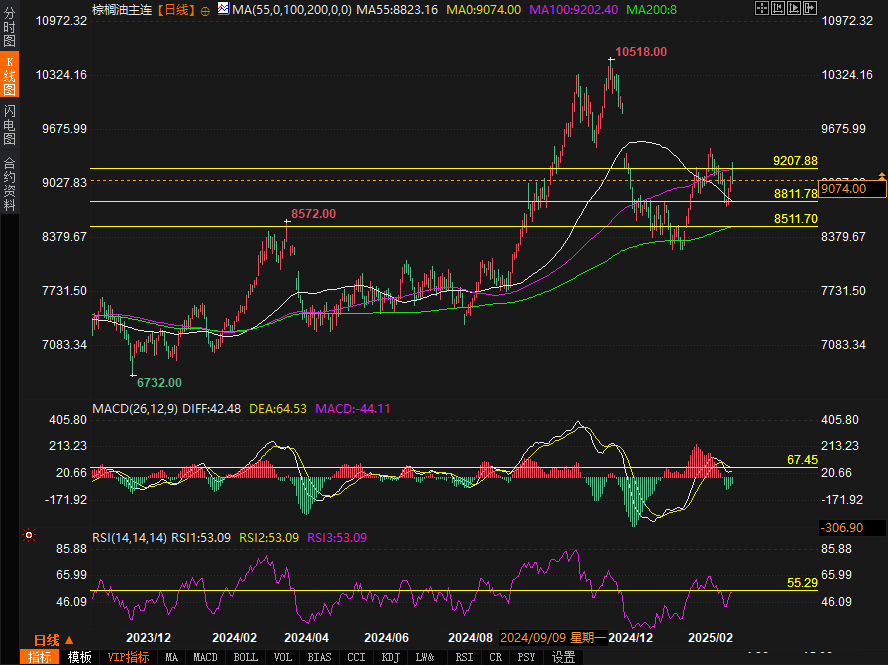 大商所棕榈油主连日线图则显示,价格在9074元/吨附近反复震荡,多空博弈激烈。中长期均线系统逐渐收敛,若价格无法有效突破上方压力,则可能向下测试8800-8900元/吨区间支撑。从量能来看,近期回调伴随持仓量减少,反映部分资金离场观望情绪升温。