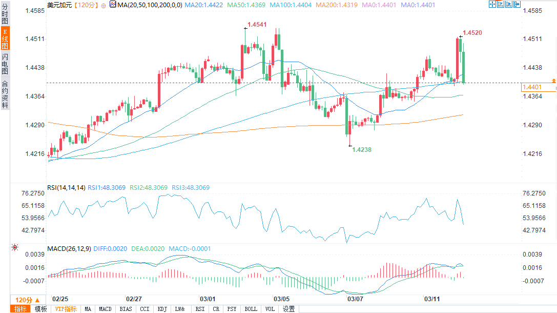 汇通财经APP讯——周二(3月11日)美盘时段,美元/加元盘中报1.4395,跌幅0.3%。美元/加元盘中出现大幅上涨,随后又快速回落,显示出市场多空双方力量在不断博弈。加元在外汇市场中成为关注焦点,投资者纷纷担忧其后续发展态势。