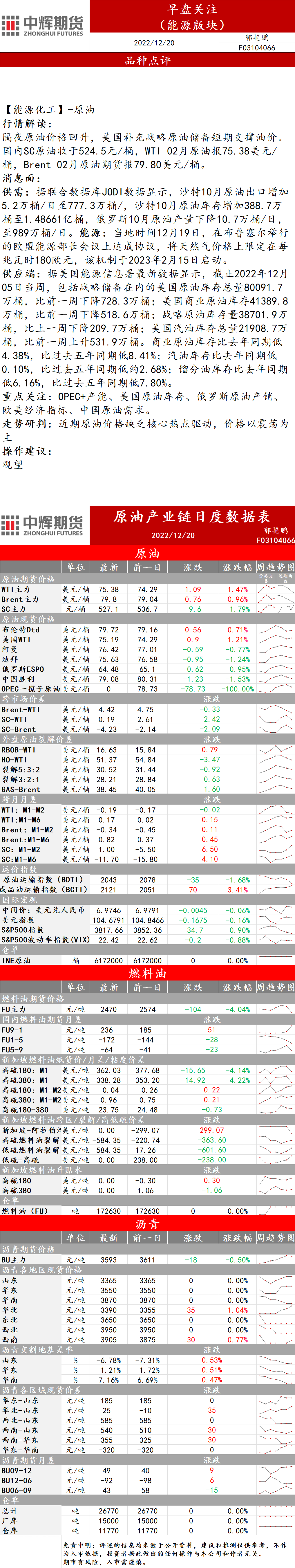 12月20日,中辉期货发布能源早盘关注,称近期原油价格缺乏核心热点驱动,价格以震荡为主,建议观望。