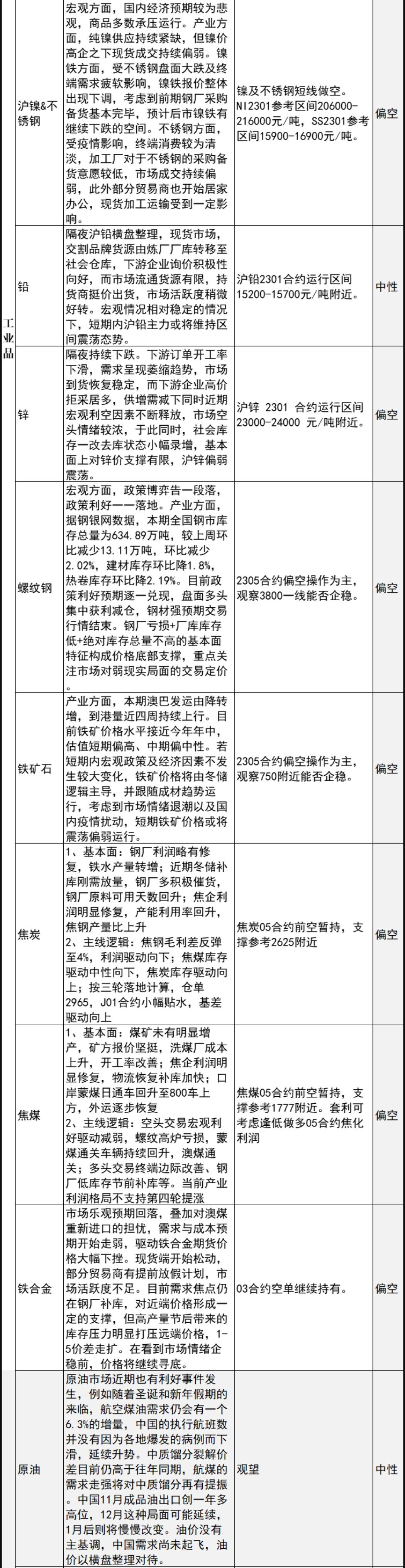 铁矿石:若短期内宏观政策及经济因素不发生较大变化,铁矿价格将由冬储逻辑主导,并跟随成材趋势运行,考虑到市场情绪退潮以及国内疫情扰动,短期铁矿价格或将震荡偏弱运行。