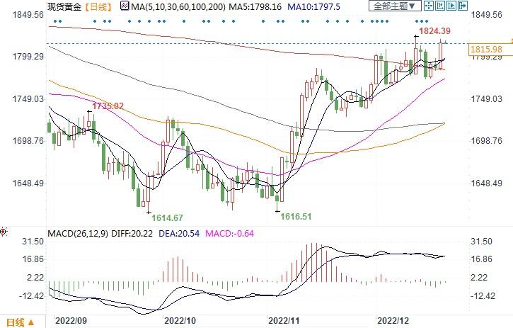 现货黄金几乎持平,下跌0.3%。此前,金价在12月出现反弹,从本月初的每盎司1750美元的低点升至周二每盎司1830美元的高点。