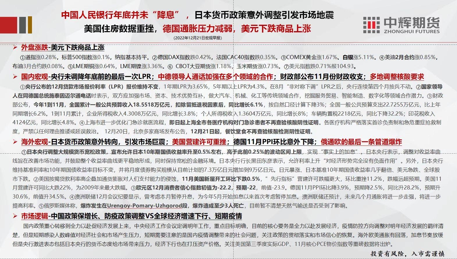 12月21日,中辉期货发布宏观早报,称欧美通胀有回落,加息节奏放缓,但是央行激进表态给市场带来压力,经济下行也打压资产价格,本周关注美国第三季度实际GDP,11月核心PCE物价指数等数据。